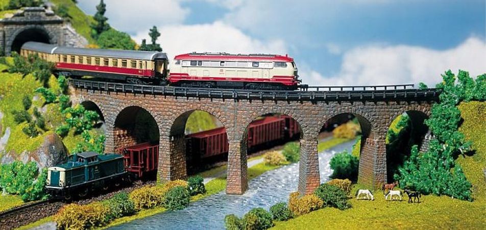 Maquette FALLER représentant un viaduc en pierres, idéal pour modelisme ferroviaire et dioramas