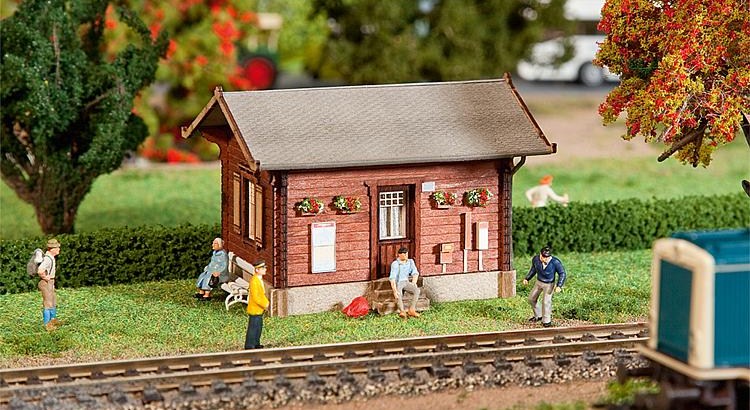 Un arrêt typique. Particulièrement bien adapté à de petites installations et des circuits annexes. Mélange de matériel en bois et de pièces en carton spécial. Les pièces en bois disposent également d'une lasure de couleur.