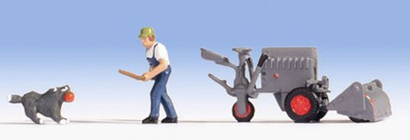 Accessoire de décor NOCH représentant une faucheuse débrousailleuse avec son conducteur "combattant" un chien