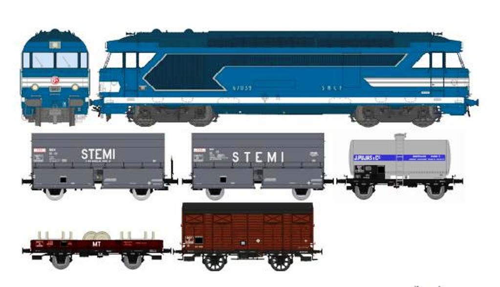 Modèle réduit REE représentant un coffret avec une locomotive BB67039 du dépôt de Rennes, Plaques époque III avec 5 wagons de marchandises se composant de :