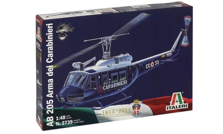 Carabinieri Maquette Italeri représentant un hélicoptère, le Bell AB 205 qui est la version du célèbre UH-1 "Huey", largement utilisé par l'armée dans la guerre américaine au Vietnam, produit sous licence en Italie pour les forces armées et la police de ce pays, en plus de l'exportation vers certains pays d'Europe et du Moyen-Orient.