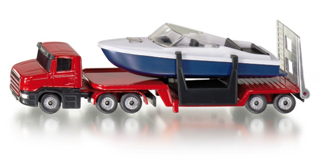 Modèle réduit Siku représentant un camion surbaissé avec bateau