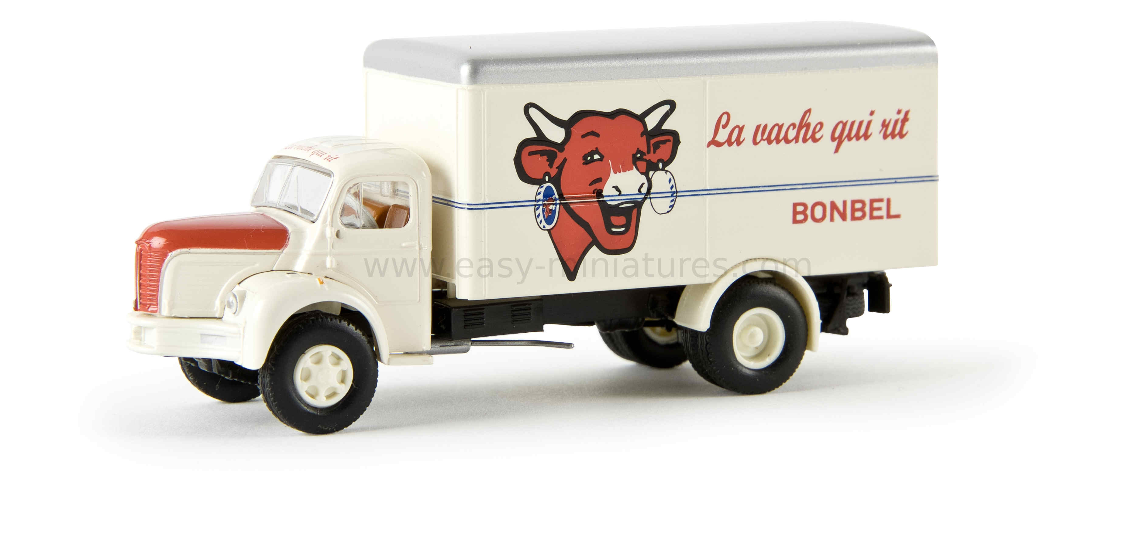 Véhicule miniature BREKINA représentant un camion tolé Berliet GLR 8 avec publicité "La vache qui rit" (véhicule datant de la période 1949 à 1963).