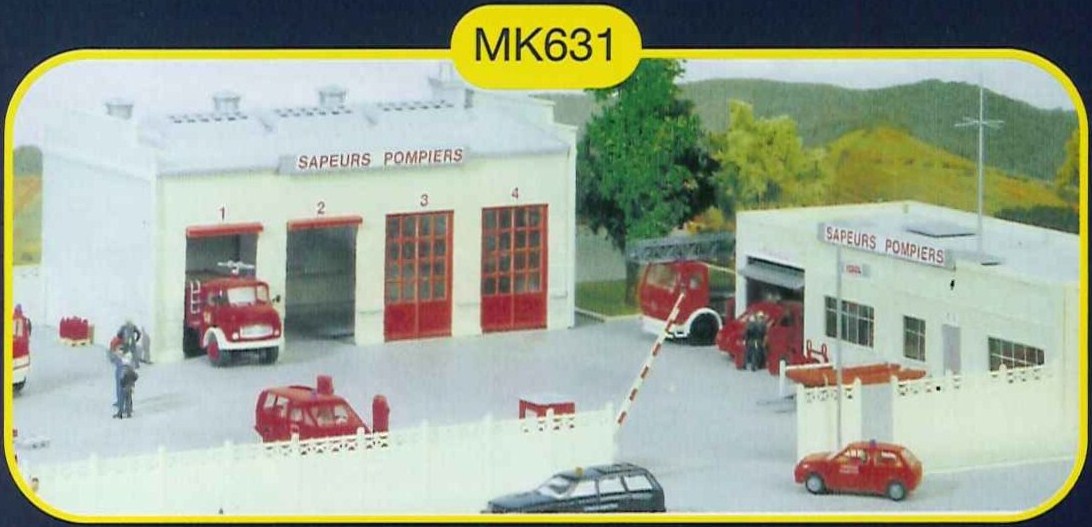 Maquette plastique à l'échelle HO (1/87ème) de la marque MKD représentant les bâtiments d'une caserne de pompiers française.
