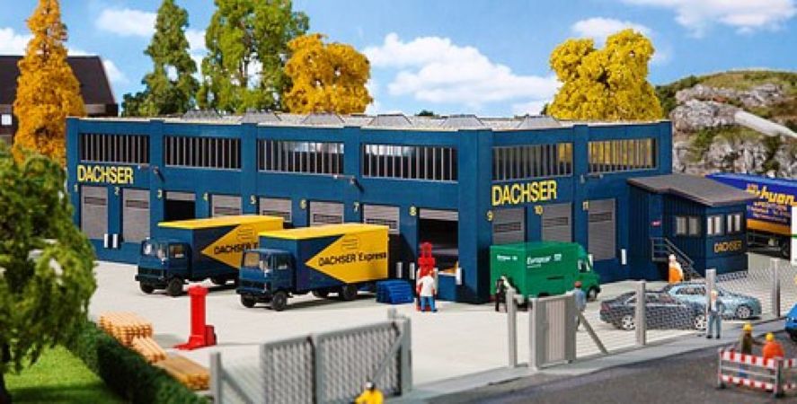 Maquette faller représentant un dépôt moderne avec stockage de plain-pied,la société de logistique »Dachser". Le parallélépipède fermé avec le toit plat de gravier est équipé pour la réception de marchandises avec un total de 19 portes à enroulement.