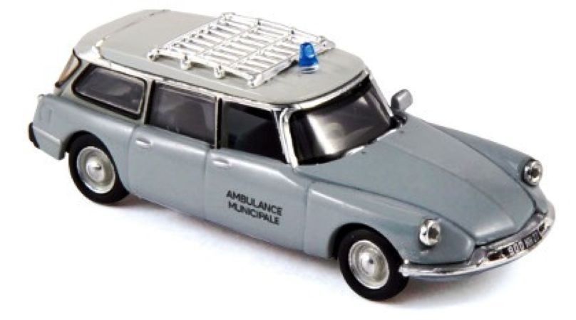 Modèle réduit finement détaillé représentant un véhicule Citroën ID 19 break, avec le marquage "Ambulance municipale" et girophare non fonctionnel
