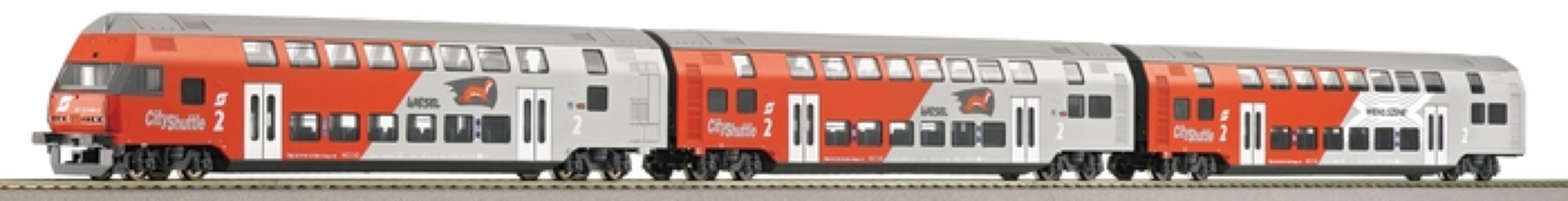 Ce coffret réf 64010 de la marque Roco est composé de deux voitures à deux niveaux de 2ème classe et une voiture-pilote à deux niveaux 2ème classe. Il s'agit d'une réédition pour la première fois en version "Wiesel" (belette) rouge et gris clair.