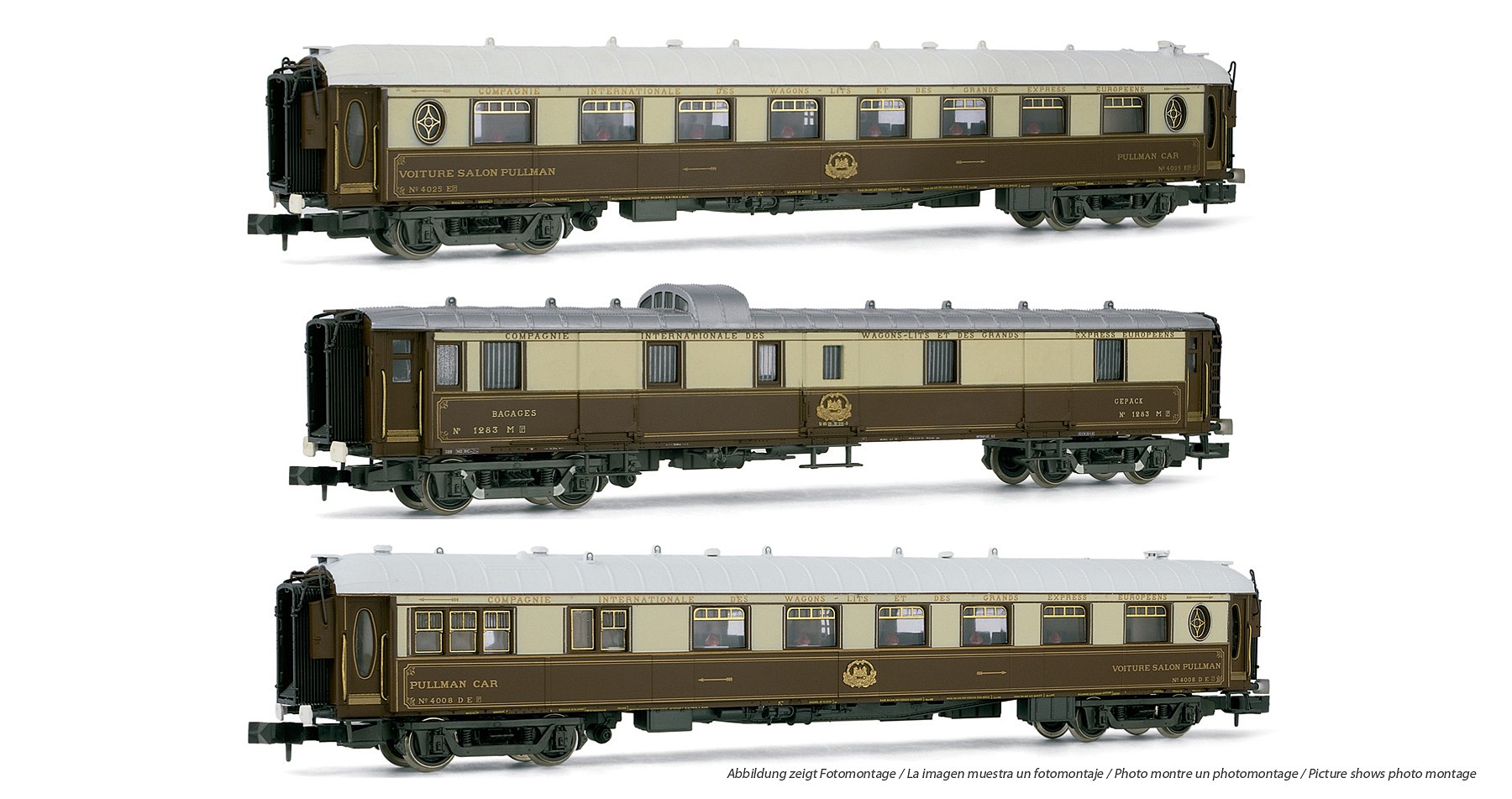 Coffret ARNOLD contenant 3 voitures de la CIWL en livrée brun crème.