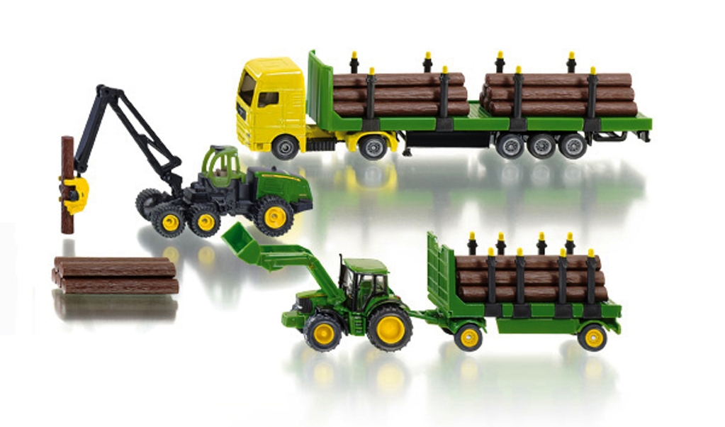 Comprenant une abatteuse John Deere, un tracteur John Deere avec remorque forestière et un grumier, il permet au petit agent forestier de recréer l’intégralité de la chaîne d’abattage dans la forêt.