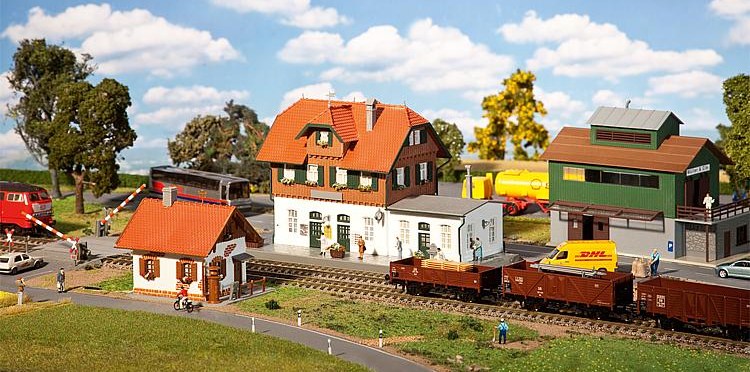 Ce set de gare permet de réaliser un complexe de gare complet typique pour la campagne, incluant la gare avec de très beaux accessoires en bois et un étage massif sur socle, un entrepôt de marchandises avec rampe de chargement et une petite maison de garde-barrière avec 2 barrières, afin de créer un passage à niveau.