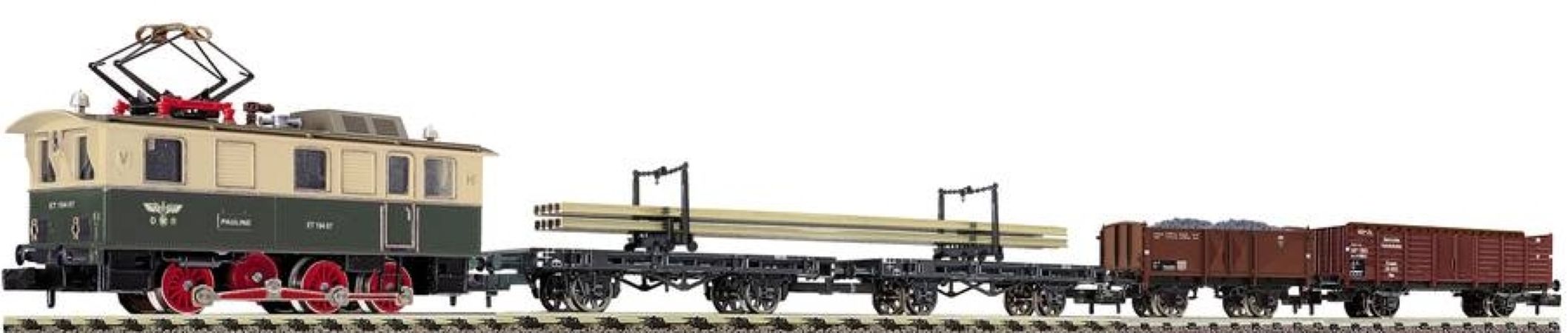 Ce coffret est parriculièrement attrayant grâce au chargement livré avec les wagons : les wagons à traverse pivotante transportent les rails, un wagon de marchandise découvert est chargé de ballast, un autre de bois de traverse de rail.