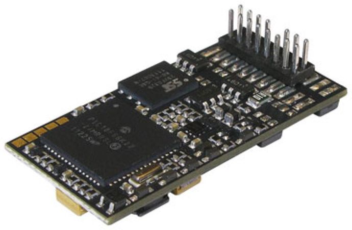 Nouveau décodeur enfichable Roco avec fiche à seize pôles et équipé d'une rétrosignalisation. Possibilité de mise à jour. Operation possible en système d'exploitation multi-protocole. Le décodeur est équipé d'un réglage du moteur. Il appuie des tronçons de freinage. Compatible avec la norme de la NMRA. Les adresses des locomotives sont programmables et tous les paramètres d'exploitation sont accessibles sans nécéssité d'ouvrir la locomotive. Il est équipé d'un dispositif de protection contre la surtension. Fonctions RailCom** : Deux feux avant et deux fonctions.