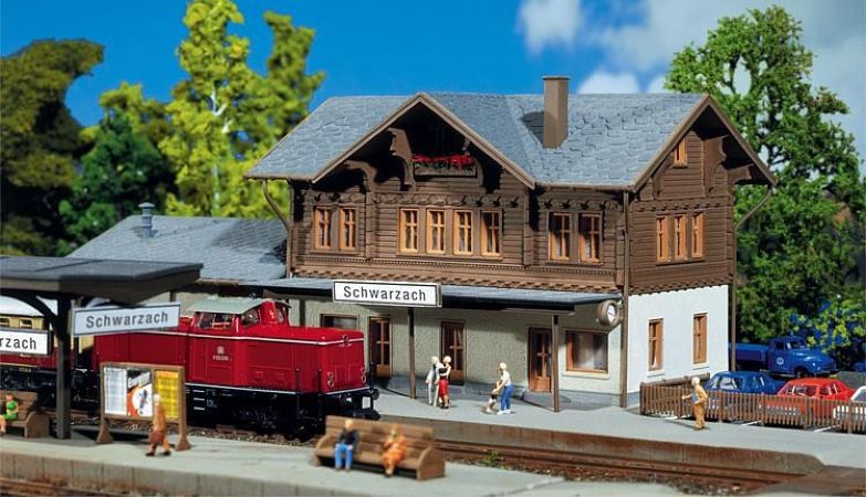 maquette Faller représentant la gare de Schwarzach avec hangar à marchandise annexé et quai couvert.