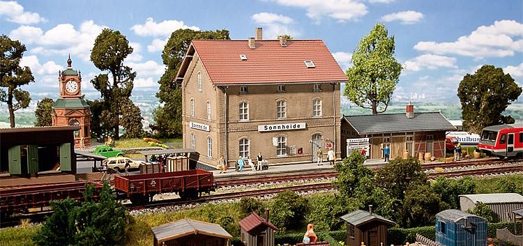 Maquette FALLER d'une gare de ville provinciale avec une construction à tuiles et avec quai de gare. La couleur classique permet une application dans toutes les régions. Les frontons disposent de fenêtres différentes et d'un ornement détaillé.