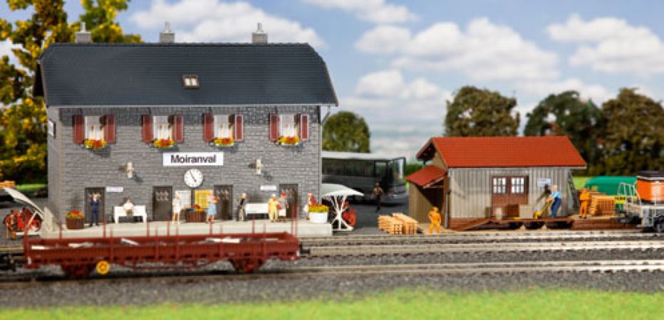 Maquette FALLER représentant une gare voyageur typique de France, avec petite remise et abris pour vélos