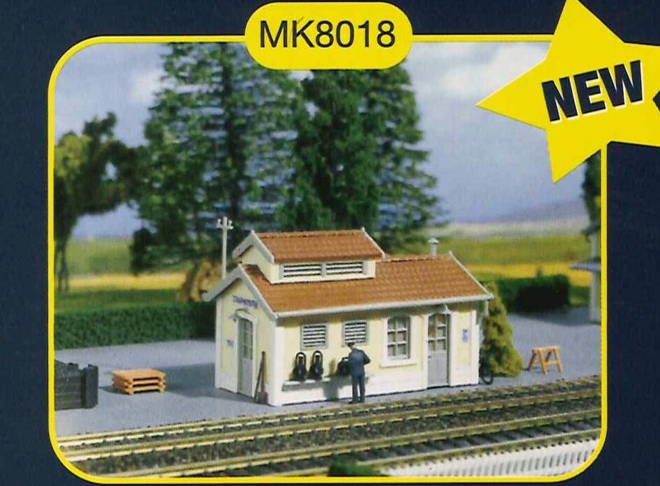 Maquette en plastique à l'échelle HO de la marque MKD, représentant un bâtiment et des accessoires typiquement français.