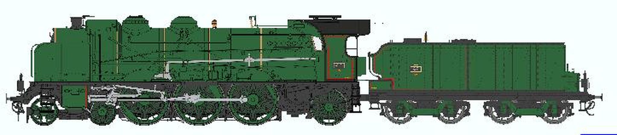Machine 231 D 5 - PLM LYON MOUCHE - cheminée simple, petits écrans fumée, pompe Fives-Lille, ACFI premier type, grosses lanternes, tender 30m³ sans hotte, Vert PLM filets rouges - Réseau PLM