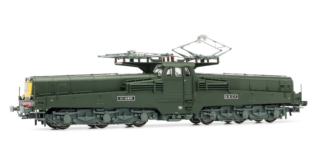 Locomotive électrique CC 14000, livrée verte, faces frontales jaunes, fanaux fonctionnels