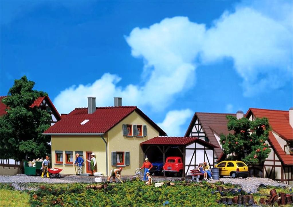 Maquette Faller représentant une maison de lotissement avec son abri.