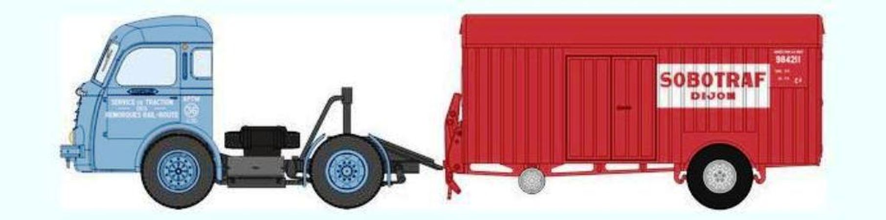 Véhicule REE représentant un tracteur Panhard Movic "APTM" bleu et sa remorque UFR "SOBOTRAF"