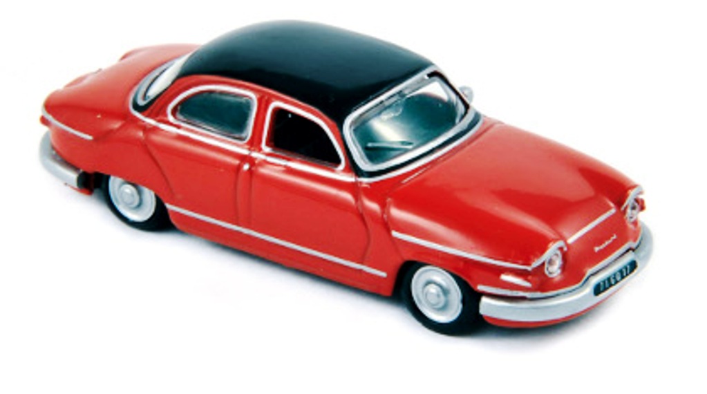 Modèle réduit finement détaillé représentant un véhicule Panhard PL17 - 1961 de couleur rouge avec un toit noir
