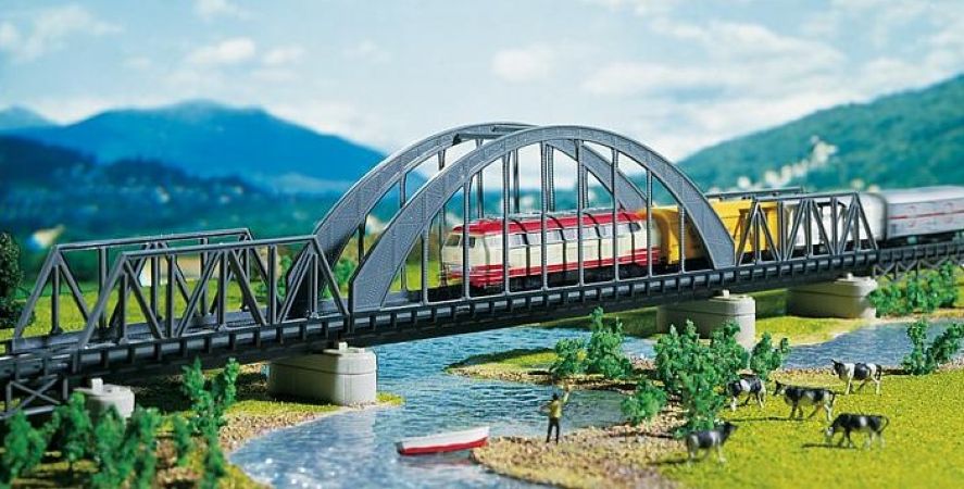 Cet article Faller ref 222583, livré en kit à assembler soi-même, comprend le pont en arc, les 2 ponts métalliques à caissons de chaque coté, ainsi que des piliers (4 x 10 et 4 x 5 mm, identique à la référence Faller 222548). Les fixations pour les poteaux de caténaires sont jointes.