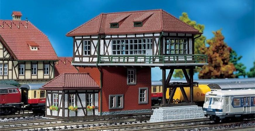 Maquette de la marque FALLER représentant un poste d’aiguillage à 2 voies sous tension.