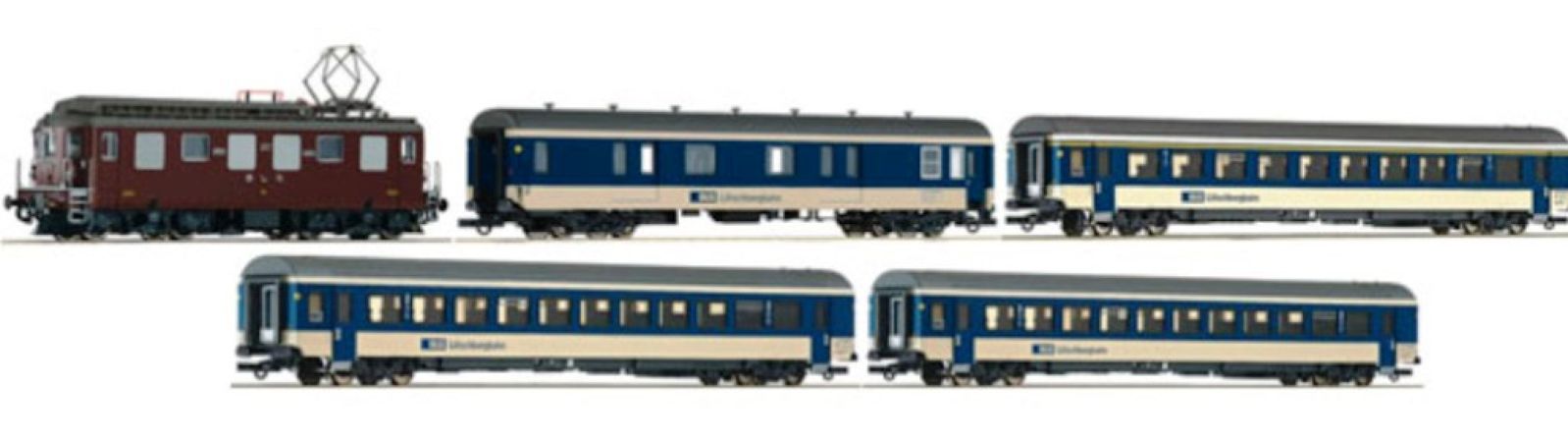 Modèle réduit Roco représentant une rame complete Ae4/4 BLS avec 3 voitures voyageurs et une voiture fourgon.