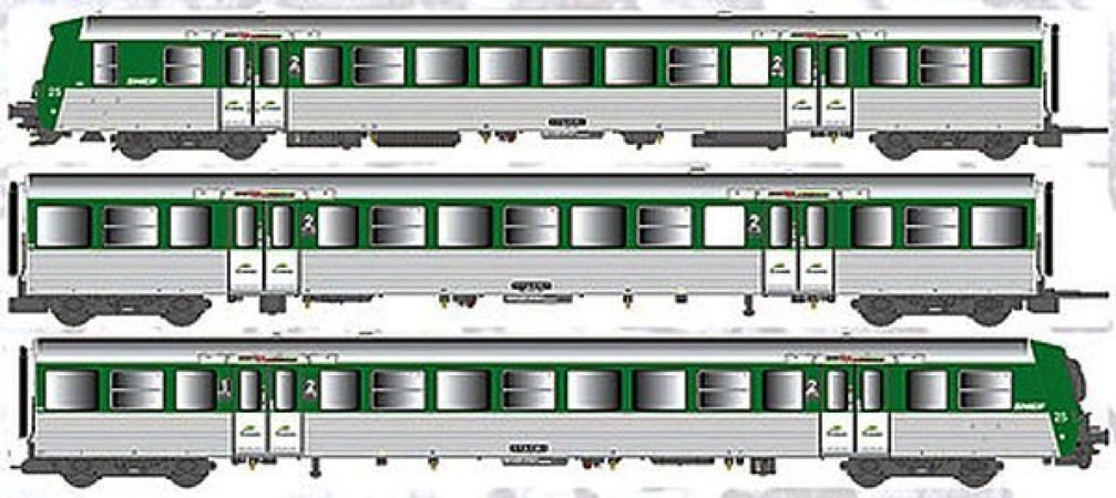 Modèle réduit EPM sze composant d'un coffret 3 éléments Rames Réversibles Régionales (RRR) BDx + Bz + AB, vert / inox, logo nouilles, 3 éléments, Région Auvergne, 4 phares, N°25