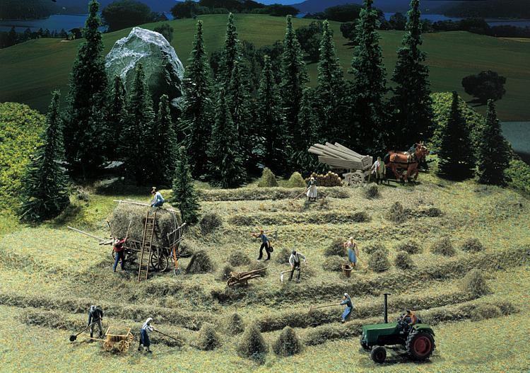 Ce coffret contient tout ce dont on a besoin pour la fenaison: plusieurs tas de foin, andains ratissés, charrette chargée de foin, des faux et accessoires. Y compris des fibres de foin et de la colle.