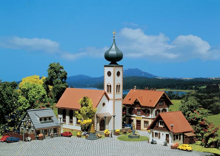 Comprenant les maquettes église villageoise, maison à pans de bois, maison individuelle, restaurant et des pièces de décoration pour la place du village.
