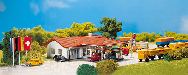 Reproduction fidèle à l’original d’une station service des années 80. Les rangées de pompes se situent sous un toit en croupe. Bandes décoratives de différentes sociétés pétrolières comprises.