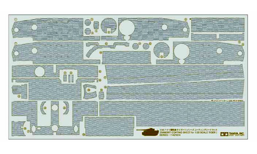 Maquette Tamiya représentant accessoire de décor pour char de combat. Ces stickers en relief permettent de représenter facilement le revêtement Zimmerit (pâte anti-magnétique) sur le char Tigre I Milieu de Production (réf.35194) ou, Production Tardive (réf.35146). Les motifs sont prédécoupés à la forme de la partie du véhicule à couvrir. On les applique avant mise en peinture