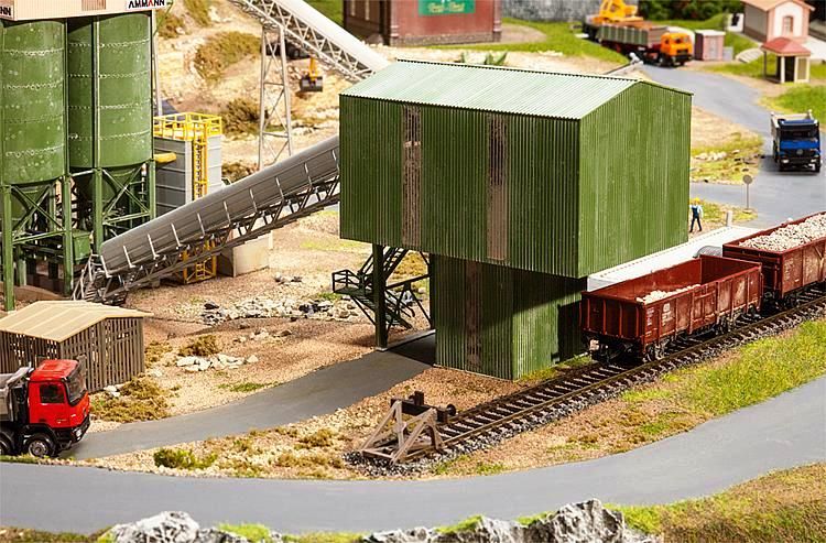 Maquette Faller représentant une tour permettant le chargement de camions et de wagons dans une usine de ballast.
