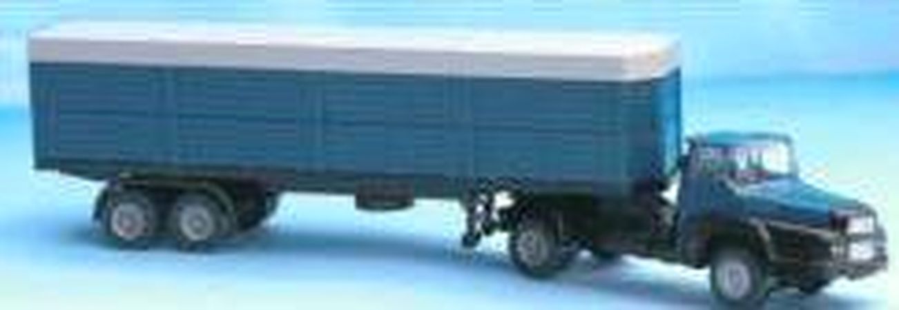 Modèle réduit représentant un Tracteur UNIC avec remorque bâchée de couleur bleu