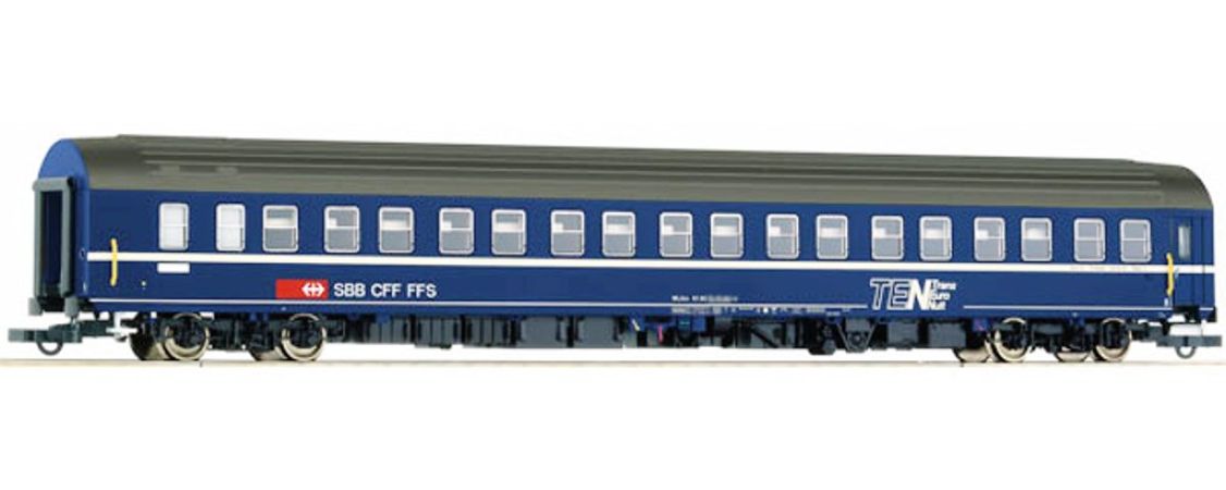 Modèle réduit Roco représentant une voiture-lits de type T2S des Chemins de fer fédéraux suisses.