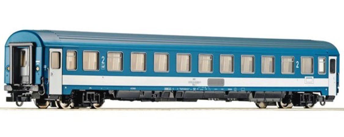 Modèle réduit Roco représentant une voiture de voyageurs Eurofirma 2ème classe des Chemins de fer de l’État hongrois. Modèle dans un coloris actuel avec aménagement intérieur.