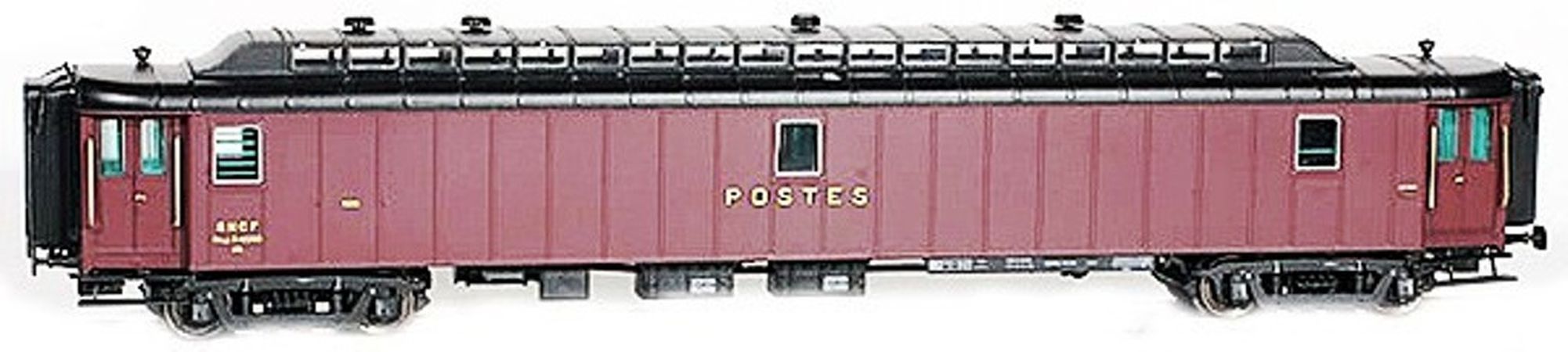 Modèle réduit LS Models représentant une Voiture type PAyi Y2 livrée brun PTT, toit noir, marquages Postes, soufflets, sans bandeau de protection