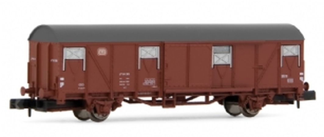Modèle réduit ARNOLD représentant un wagon couvert Gbs252 de la DB, avec chassis de couleur brune.