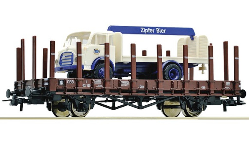 Modèle réduit Roco représentant un wagon plat des Chemins de fer fédéraux autrichiens chargés avec un camion Steyr 480 "Brasserie Beer Truck Zipfer"
