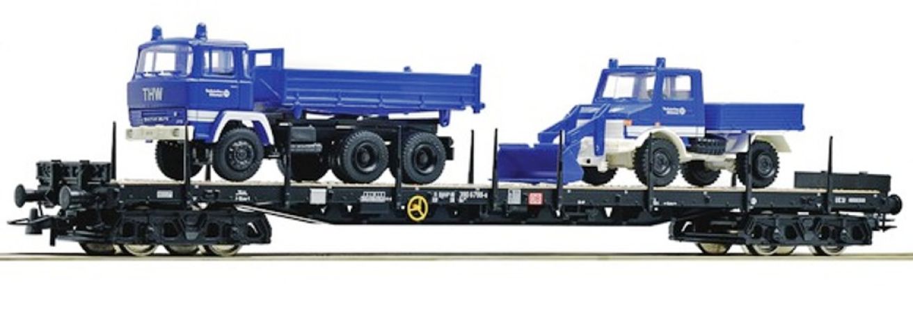 Modèle réduit Roco représentant un wagon plat chargé de deux véhicules : un camion Unimog et un camion Magirus des secours techniques