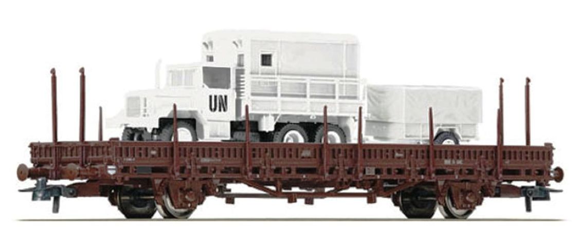 Modèle réduit Roco représentant un Wagon à ranchers amovibles des Chemins de fer autrichiens, chargé d’un GMC M35 avec camion radio et remorque de l’armée fédérale autrichienne.