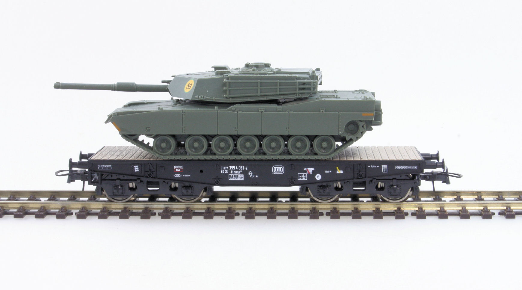 Wagon plat charge lourde type Rlmmp DB avec char M1 Abrams N°31 80 399 4 061-2