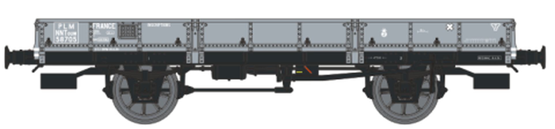 Modèle réduit REE représentant un wagon plat OCEM 29 PLM gris avec roues à rayons, frein à main, boites d’essieux à coussinets, N° NNTouw 58706