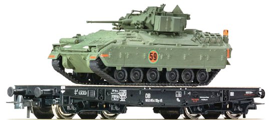 Modèle réduit Roco finement détaillé représentant un wagon pour transport de charges lourdes des Chemins de fer allemands, chargé d’un véhicule de combat M3 Bradley de l’armée américaine.