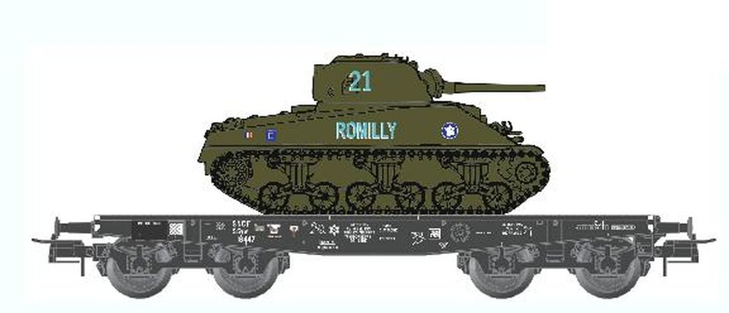 Wagon Porte-char SSyw 18447 SNCF Ep.III + Char Sherman "ROMILLY"