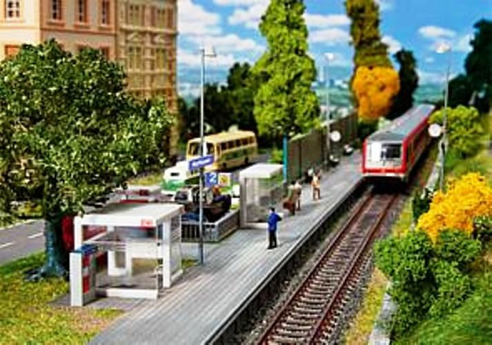 Maquette Faller contenant un abri de quai et différents accessoires tels que indicateurs de destination des trains, billetterie, panneaux d'information, lampes de plate-forme (sans fonction), et un bord de plate-forme flexible.