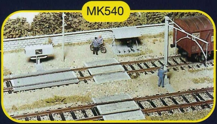 Maquette plastique de la marque MKD comprenant 1 garage à vélos, 1 bascule, 1 gabarit et 1 passage planché.