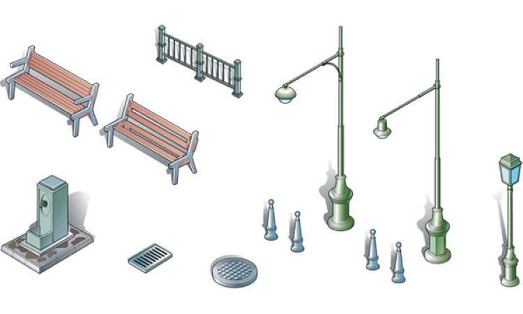 Maquette Italeri représentant une série d'accessoires urbains se composant de : Fontaines, bancs, plaques d'égoûts, barrières et éclairage public pour dioramas ou jeux de stratégies 2ème Guerre Mondiale.