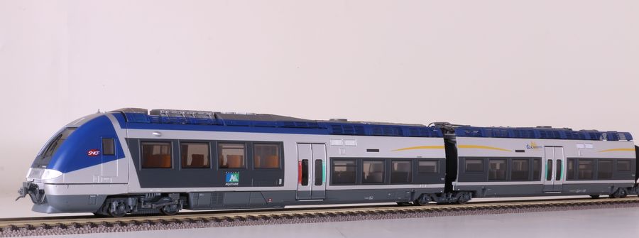 Modèle réduit de la marque LS MODELS, très finement détaillée de l'AGC B 80801 à trois caisses, bleu/gris métallisé, livrée Aquitaine, première décoration